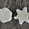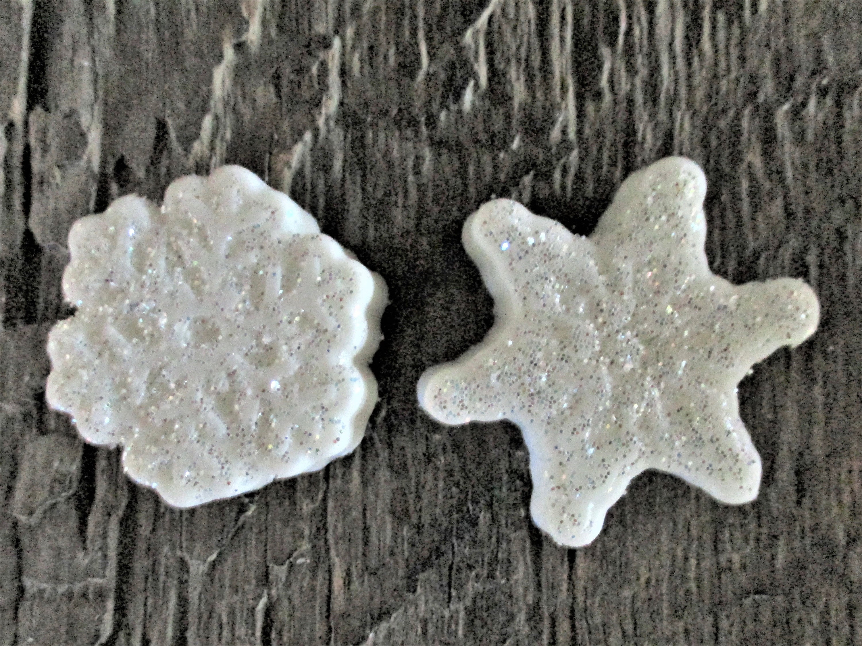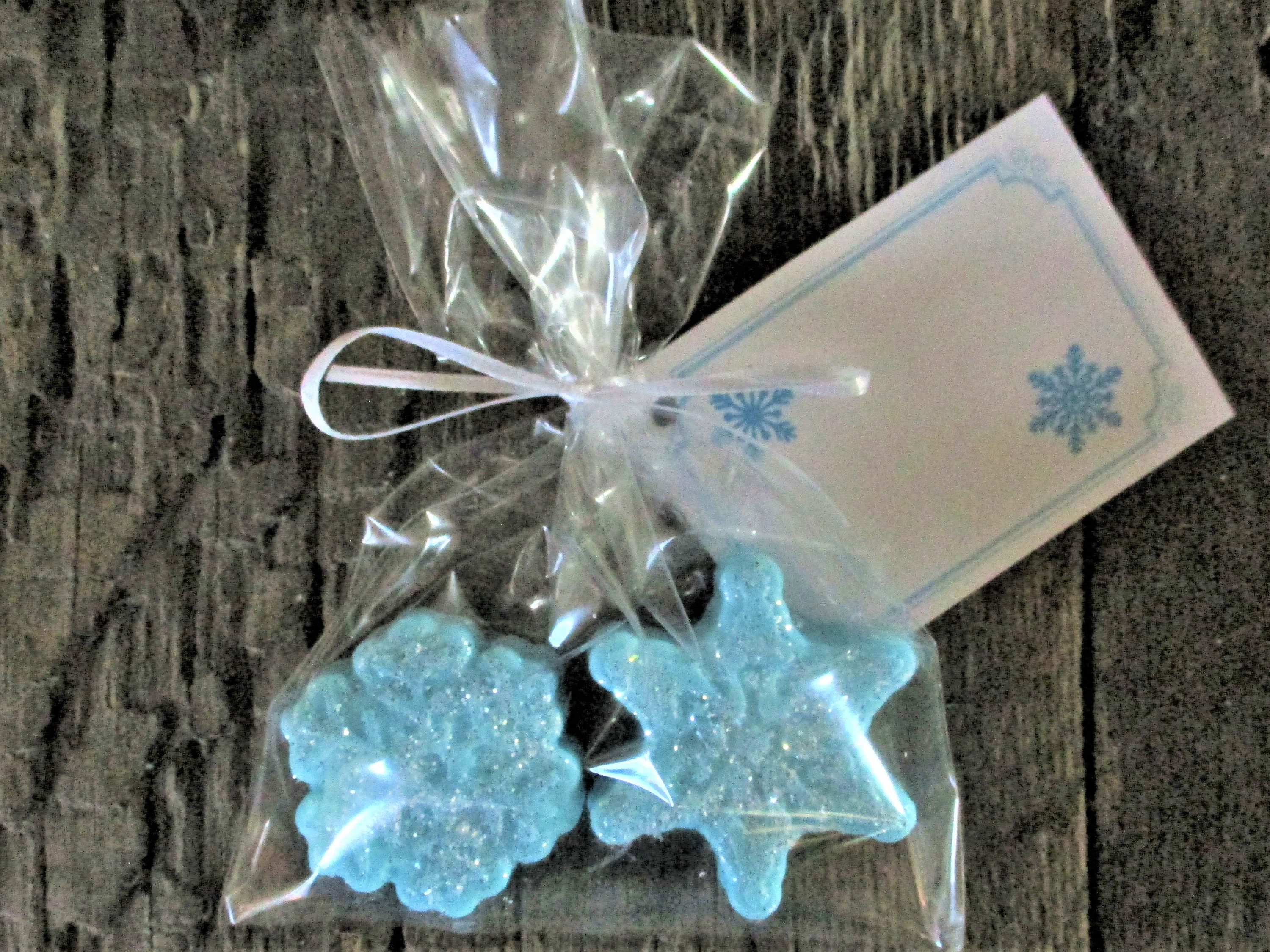 Two glittering snowflakes are wrapped in a clear cellophane gift bag ready for gift giving, party favors, stocking stuffers. Snowflakes measure between 1 1/2" and 1 3/4" wide and 1/2" tall. The weight of the 2 snowflakes is 1.4 ounce.
