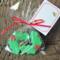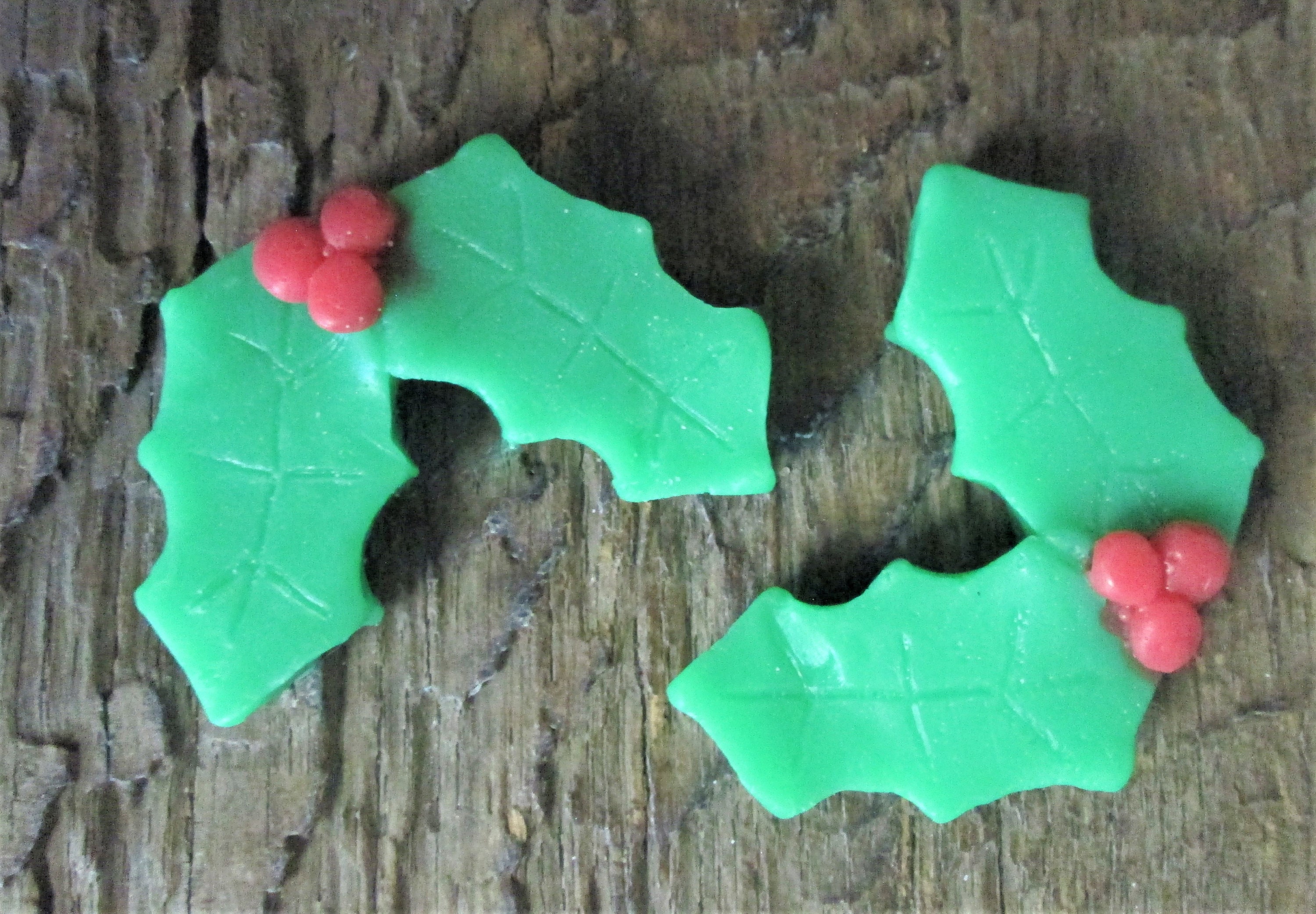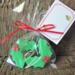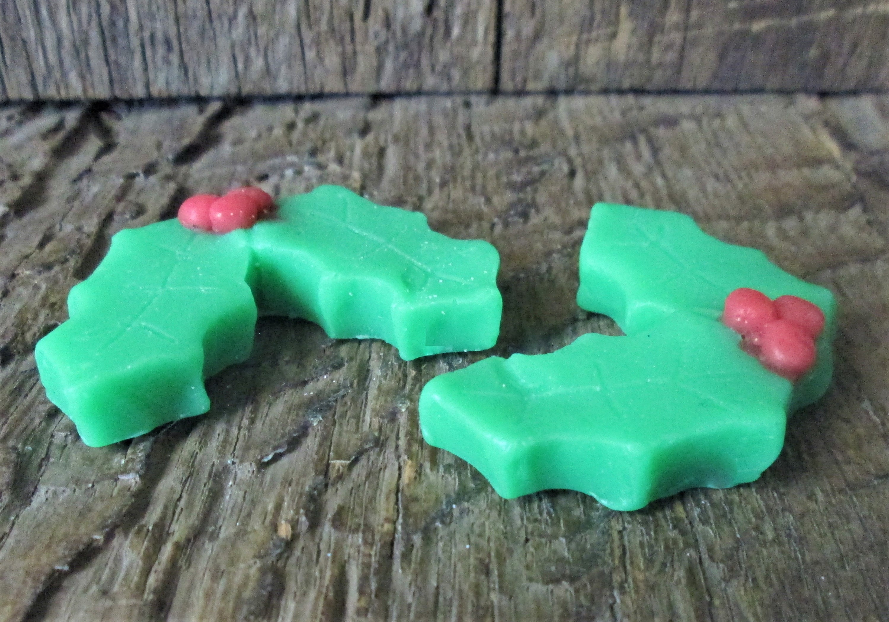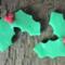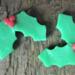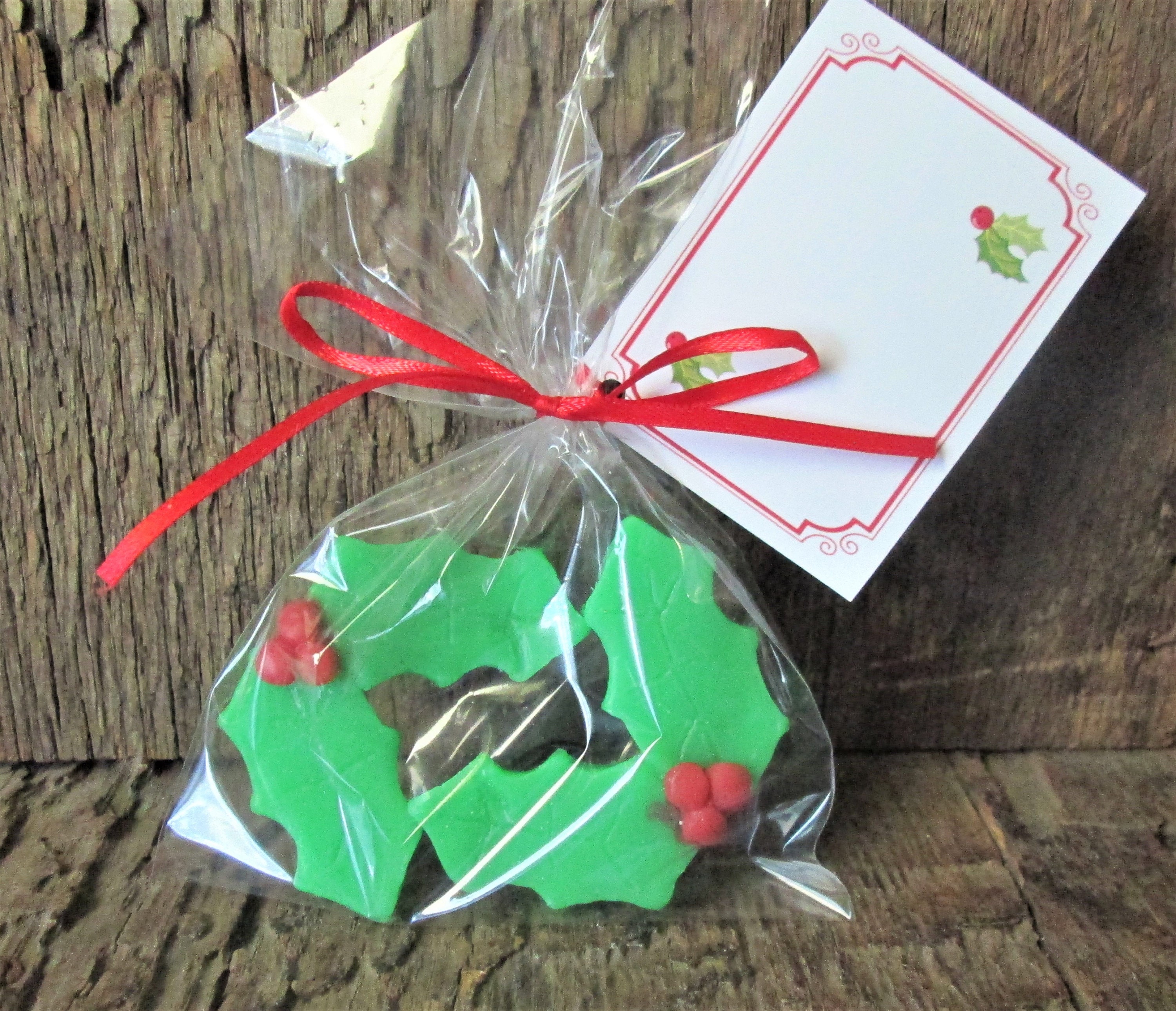 Two pairs of shea butter holly leaves and berries soap favor. Holly favor is perfect for Holiday parties, birthdays, bridal showers. Holly leaves measure 2 1/4" wide and 1 3/4" long. The pair weighs 1 oz. Holly comes wrapped in a cellophane favor bag with red ribbon and personalized tag.